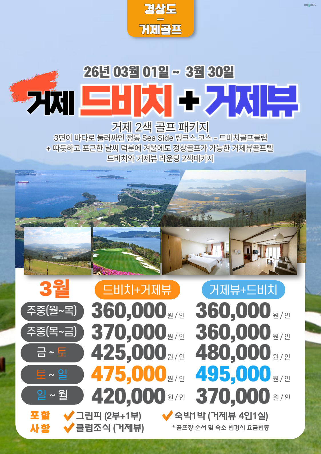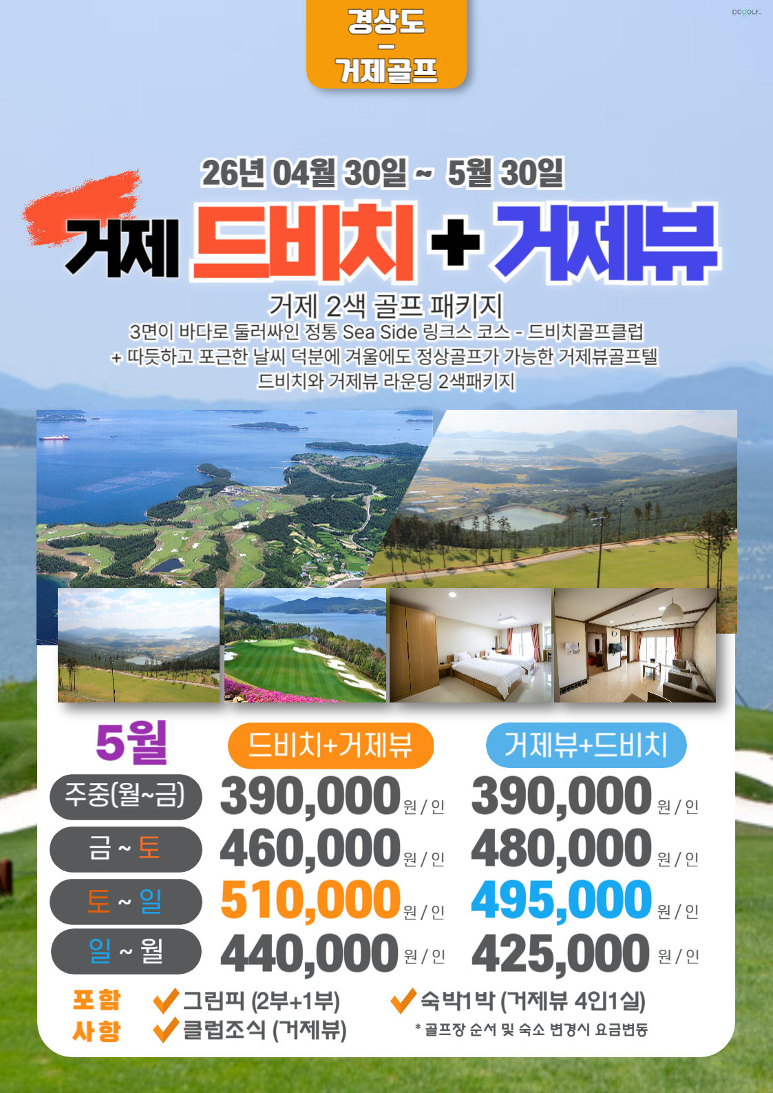 ✨상품구성 : 드비치 18홀 + 거제뷰 18홀+ 거제뷰 4인실 + 클럽조식+커피